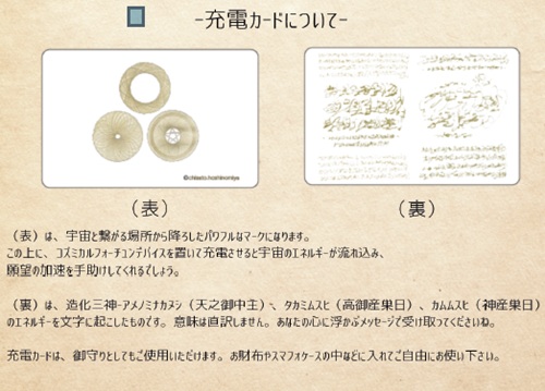 ![]() 付属品 ⚫︎あなただけに書いたオリジナル宇宙語カード あなたにむけた字宙語メッセージカード付き。 ⚫︎充電カード(ペンダントの下に敷いてお使い下さい。) 上に乗せるだけ充電ができます。 使用方法 充電カードを使用してペンダントを充電し、宇宙のエネルギーを流入させます 財布やスマートフォンに入れて持ち運ぶことができます。 参考例 ![]() ⚫︎コズミカル•フォーチュン•デバイス ●仕様:約2.4X2.4Xl.8センチ(バチカン含ます)。 重さ/SV付け目7グラム(メテオライト含ます)。 素材/SILVER925(金メッキ)メテオライト(鉄隕石) 8ミリカポション。 牛革紐:約65センチ。 そのほか/宇宙語メッセージカード、 日本語訳カード、充電カード各1枚。 |